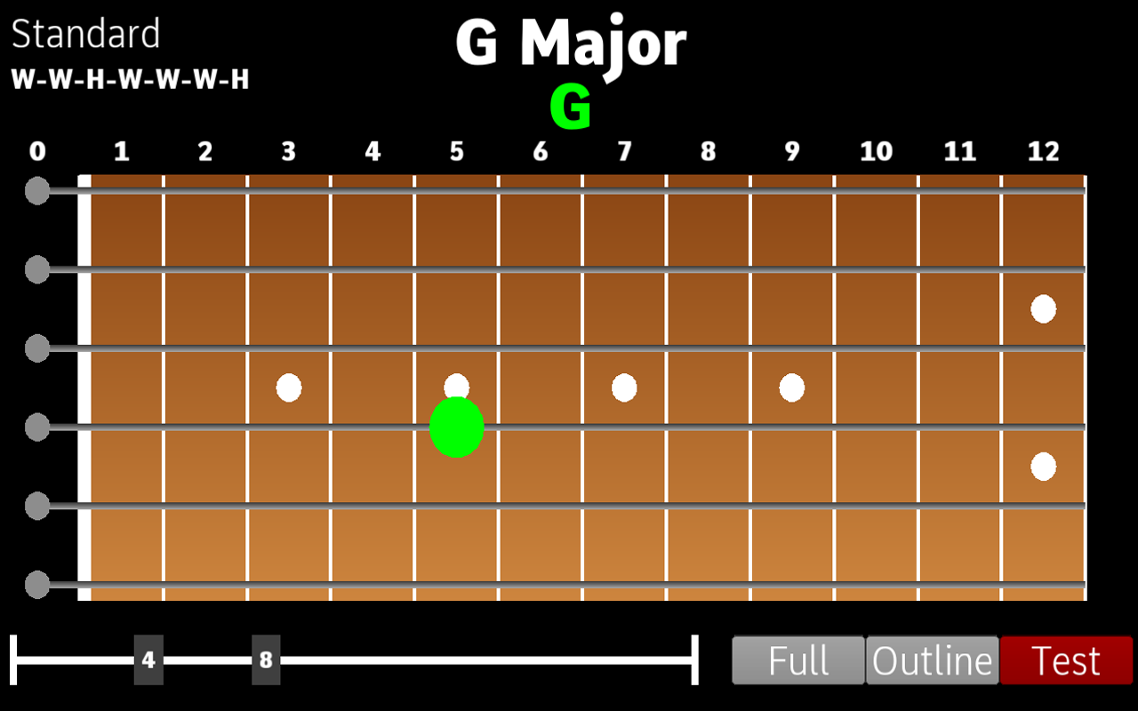 핑거 보드에 메모를 누르면 녹색 마커는 선택이 규모의 부분을 나타냅니다. 레드는 주 규모의 부분이 아니었던 나타냅니다. 하단의 슬라이더에 초점을 프렛의 범위를 조정합니다.