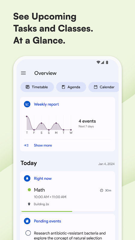 숙제, 과제, 시험 및 알림을 기록하는 것은 간편하고 빠르며, 매일 알림을 통해 아무 것도 잊지 않도록 도와줍니다. 내장된 캘린더는 학생들의 요구에 매우 최적화되어 있어 이벤트와 활동을 더 쉽게 관리할 수 있습니다. 시간표와 일일 일정을 항상 손에 두고 학습 계획을 적절하게 수립하세요. 시간표는 매우 사용자 정의가 가능하며, 각 과목에 다른 색상을 할당하고 캘린더에 저장된 이벤트를 볼 수 있습니다.