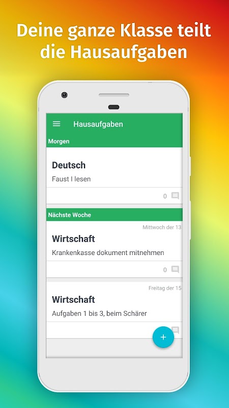 Das Allerbeste ist, du musst gar nichts machen! Es genügt, wenn nur eine einzige Person der Klasse die Hausaufgaben fotografiert oder Prüfungen einträgt, und sofort haben es ALLE der Klasse! Solange sie die App auch haben.