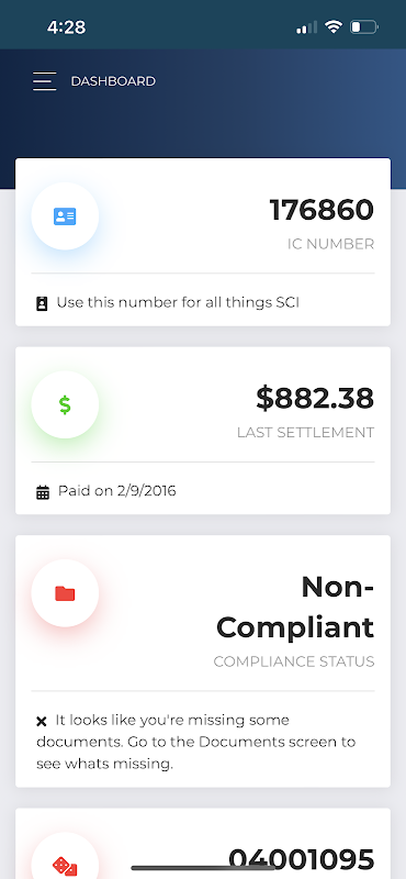 SCI 모바일 앱을 사용하면 SCI 사용자는 모바일 친화적인 방식으로 자신의 계정에 액세스하고 관리할 수 있습니다. SCI 모바일을 사용하면 계정 상태를 확인하고, 규정 준수 문제를 해결하고, 스텁 및 1099(해당하는 경우)를 보고, 사내 지원 팀과 즉시 연락할 수 있습니다.