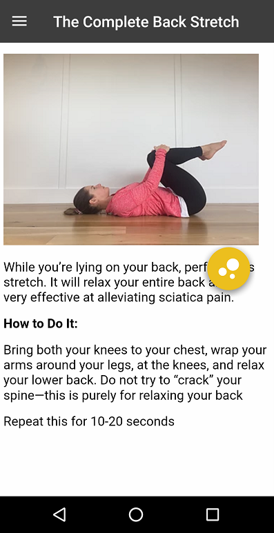 모바일 응용 프로그램에서 규칙적으로 운동을하면 좌골 신경통이 줄어 듭니다. 탈장 운동, 요추 통증 운동 및 프리폼 운동은 좌골 운동과 유사합니다. 이 운동은 일주일에 2 일 20 분 동안 만하면됩니다.
