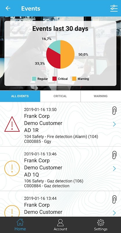 최근 이벤트 - 사이트의 최신 이벤트 및 사건을 표시합니다. 이벤트를 클릭하면 세부 정보 및 첨부 된 보고서를 볼 수 있습니다. 새로운 중요 이벤트를 가져 오면 푸시 알림이 SMS를 통해 전송됩니다.