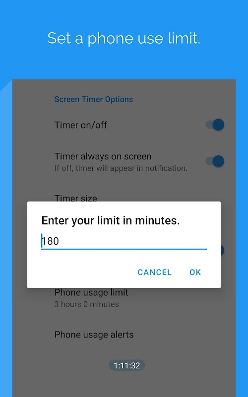 타이머를 사용하면 휴대전화를 얼마나 오래 사용했는지 확인할 수 있습니다.
