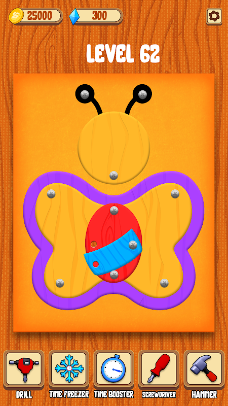 이 퍼즐에서는 나사와 볼트가 박혀 있는 나무 조각이 쌓여 있습니다. 퍼즐을 풀기 위해 올바른 순서로 하나씩 풀고 제거하세요.
