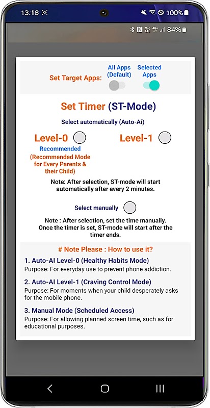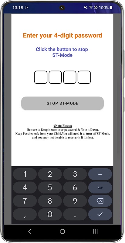 - 🛠 앱은 "있는 그대로" 제공됩니다. 패스키를 저장하세요. ST-Mode를 끄거나 사용을 중지하는 데 필요하며, 분실 시 복구할 수 없습니다. 개발자는 화면 시간 기능 이외의 사용에 대해 책임을 지지 않습니다.