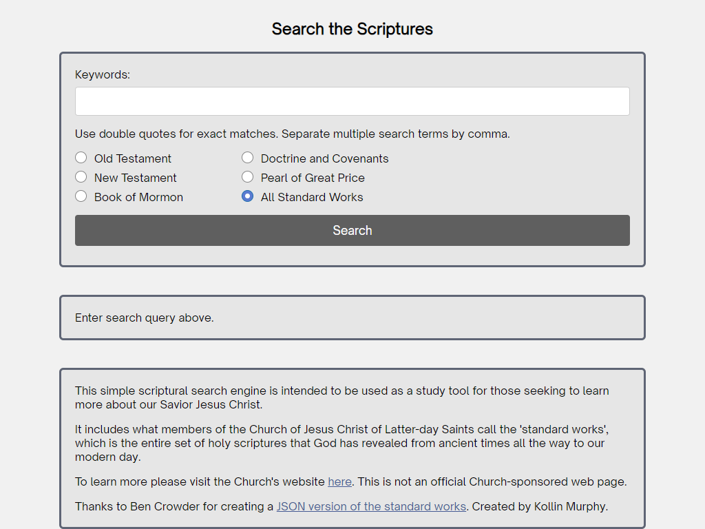 This app is intended as a study tool for members of The Church of Jesus Christ of Latter-day Saints. It provides a method to search for occurrences of words, phrases, or parts of a word in the Holy Bible, the Book of Mormon, the Doctrine and Covenants, and the Pearl of Great Price.