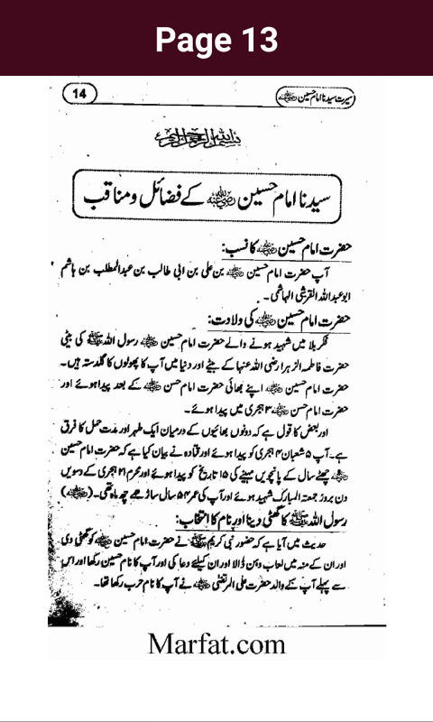 Hazrat Imam Hussain was a grandson of the Islamic prophet, Muhammad, and son of Ali ibn Abi Talib (the first Shia Imam and the fourth Rashid caliph of Sunni Islam), and Muhammad's daughter, Fatimah. He is an important figure in Islam as well as being the third Shia Imam.This book is the complete guide on the life of Hazrat Imam Hussain. Read this book and you will know the Seerat and Life of Hazrat Imam Hussain. This book Contains the complete story of Karbala. So please read this book.