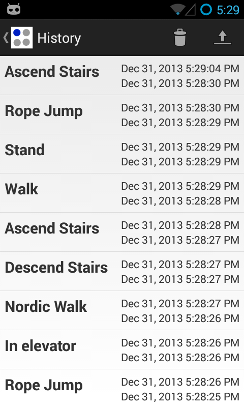 Log, label and export sensory data. This application is developed to ease the process of collecting and labeling sensory data from smart phones. Enter a label and choose associated sensors from available device sensors. Specified label appears as a round button on the application home screen and when the button is tapped, associated sensors begin recording data. Data are stored in the sqlite database and can be exported in CSV format. Collected data can be used to study various research questions in various fields such as activity recognition, indoor localization and context-aware computing.