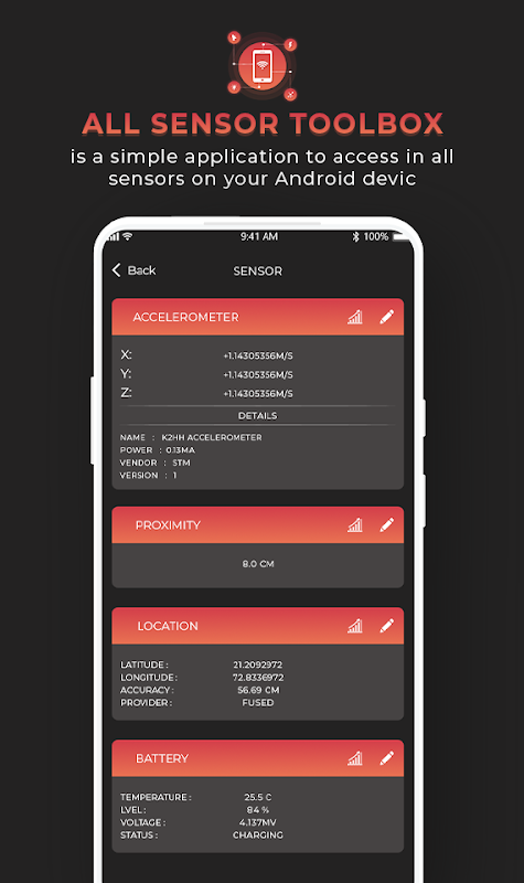 This app is a smart tool designed with simple, material design like, and speed optimized user interface. Sensors Toolbox can read data from the most commons sensors in Android phones.