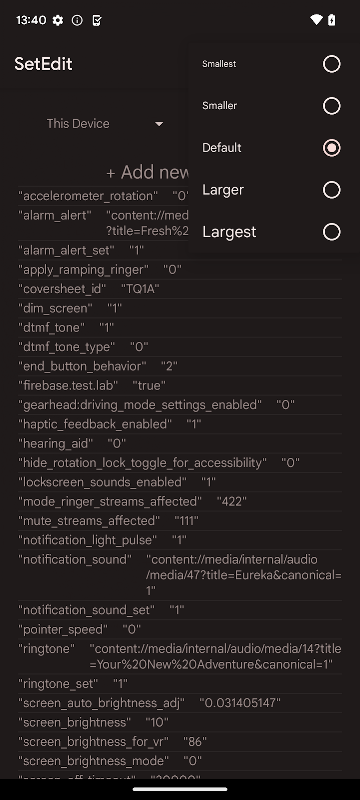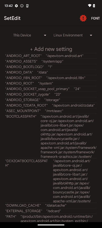 기본적으로 Android에서는 보호를 위해 SECURE 및 GLOBAL 테이블을 수정하는 것을 방지합니다. Android Jellybean 이상이 있는 경우 "pm grant by4a.setedit22 android.permission.WRITE_SECURE_SETTINGS" 명령을 사용하여 ADB 셸에서 이 보호를 제거할 수 있습니다. 이전 버전에서는 시스템 파티션에 SetEdit을 설치하여 루팅된 장치에서만 이 보호를 제거할 수 있습니다.