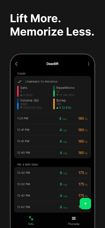• 세트를 기록할 때 마지막 세션과 반복 횟수, 무게/반복 횟수, 볼륨, 세트의 백분율 개선 사항을 실시간으로 비교하여 매 세션마다 점진적인 과부하를 달성하고 있는지 확인하세요.