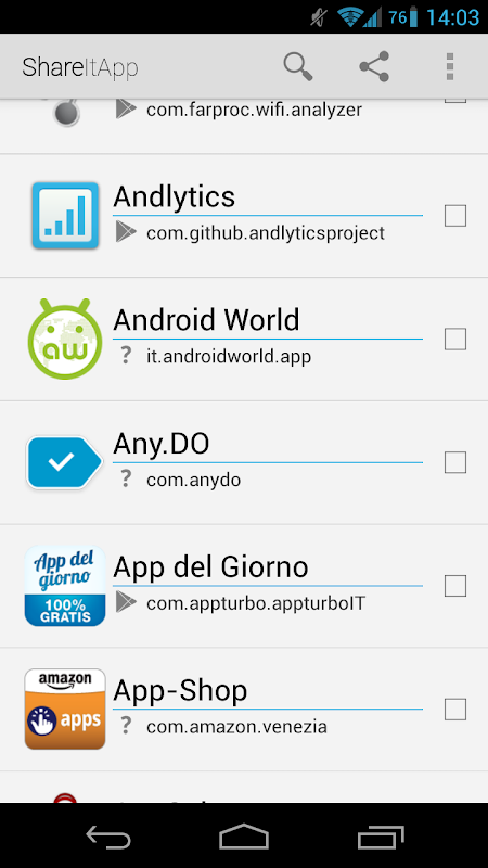 - Share app link bu pressing on the third button or send its APK by long pressing on the share button