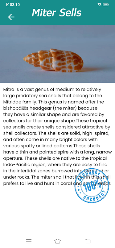 때때로 많은 달팽이를 찾거나 보지만 이름이 무엇인지, 어떤 종에 속하는지 알지 못하는 경우가 있습니다. 이제 여기에 마음에 떠오르는 질문이 있습니다. 이 생물은 무엇입니까, 곤충 또는 동물입니까, 물고기입니까, 포유 동물입니까, 새입니까? 우리 앱은 사진을 찍는 것만으로 달팽이 또는 곤충의 이름과 종을 알려줍니다. 살아 있거나 죽은 동안 쉘 스캐너 앱 쉘 감지기로 달팽이와 쉘을 캡처하거나 쉘을 캡처할 수 있습니다. 우리의 앱 셸 식별자를 사용하면 셸 사진을 찍고 앱에서 제공하는 곤충 종 외에 우리가 제공하는 셸 목록과 비교할 수 있습니다. 셸 식별자는 달팽이와 달팽이 역사 및 다양한 달팽이의 모든 특성을 분석합니다. 따라서 암석 조개 사이에서 다양화할 수 있고 민달팽이, 굴, 조개 및 오징어와 같은 다른 연체 동물을 분류할 수 있습니다. 좋아하는 조개 껍질에 사랑 스티커를 추가하고 목록에 추가할 수도 있습니다.