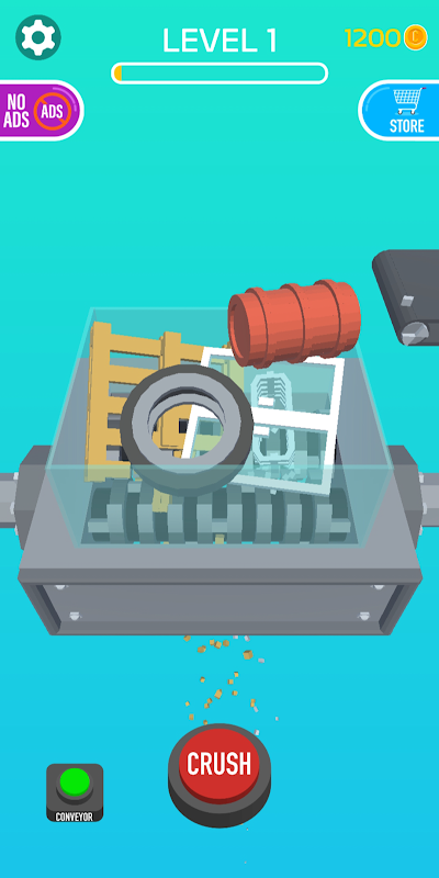 컨베이어 라인에서 슈레더에 물건을 떨어 뜨리고 부수기를보고 동전을 벌고 더 큰 시야를 위해 새 물건을여십시오!