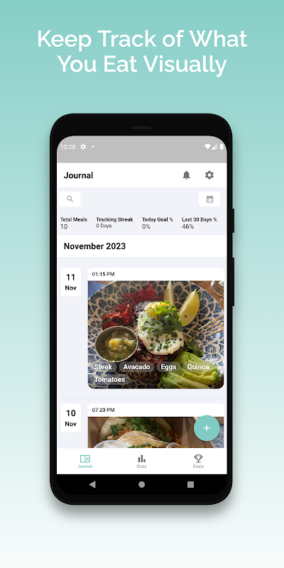 - 배고픔/포만감, 식사 타이머, 식사 이유, 식사 후 음식 섭취 방법, 기분 추적기, 함께 식사한 사람 등 40개 이상의 미리 정의된 추적 옵션을 사용할 수 있습니다.