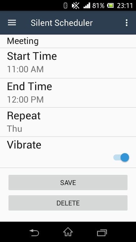 이 응용 프로그램은 모바일 장치가 주어진 시간 사이에 무음 모드 또는 진동 모드로 들어가고 나가도록합니다.