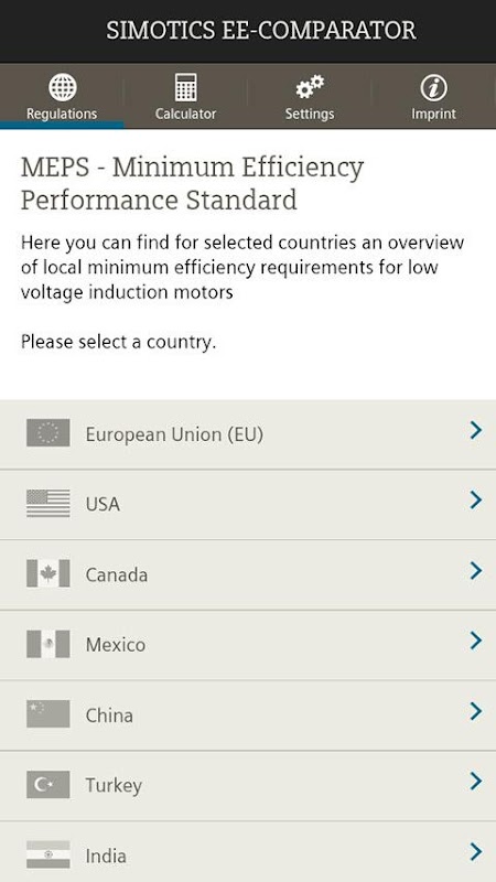 The App also offers an overview of local minimum efficiency requirements for low voltage induction motors (so called MEPS – Minimum Efficiency Performance Standards) for selected countries.