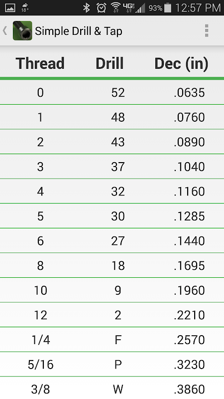 This app gives drill and tap tables for all common thread sizes including: United National Coarse, United National Fine, National Pipe Tapered, National Pipe Straight, Metric Coarse, and Metric Fine. The drill and tap tables show drill letters and decimal values.