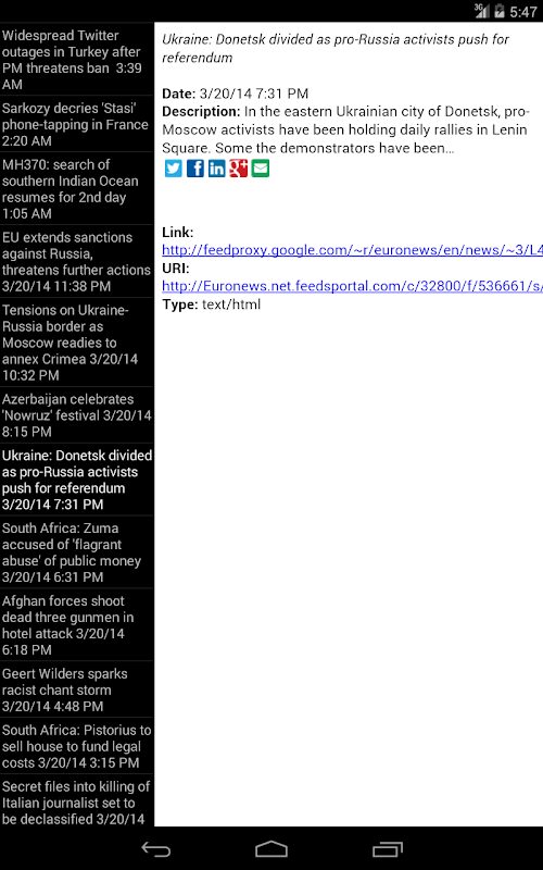 SimpleSynd is a really simple RSS and Atom feeds and podcasts syndication for Android. The application is intended for comfortable viewing, aggregation, search and add news feeds and media podcasts. SimpleSynd focuses on minimizing network traffic by performing if-modified-since queries to allow efficient updates of cached information with a minimum amount of transaction overheadcaching of queries and smart algorithm of feeds headlines update. The application has to deal primarily with text news information will no longer be idiotic pictures and flashing banners.