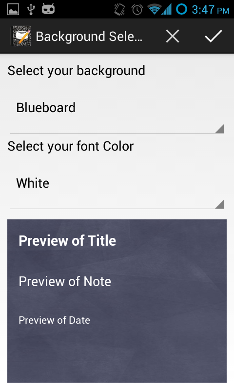 Simply Notes not only allows you to customize your background but your Font as well by selecting from a list of 15 fonts. Customize by using the Slide out menu on the left hand side.