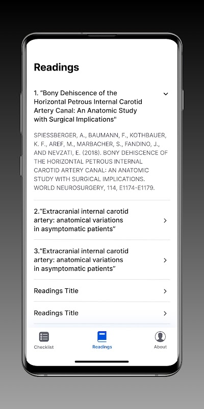 이 앱은 내시경 부비동 수술을 시행하는 수련생 및 이비인후과 의사를 돕기 위해 수술 전 부비동 수술 CT 체크리스트로 작성자가 설계했습니다. 체크리스트는 안전한 결과를 위해 수술을 시작하기 전에 CT 스캔에서 식별해야 하는 고위험 해부학적 구조를 강조하는 것을 목표로 합니다. 혈관, 안와 및 두개골 기저부 해부학과 관련된 주요 구조는 목록에서 식별, 분류 및 "확인"되어야 합니다. 이 목록은 이전에 레지던트 연수생을 위한 유용한 교육 도구로 검증되었습니다.