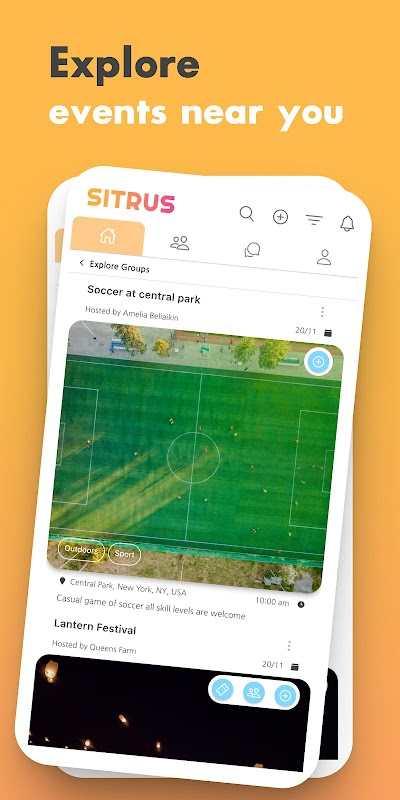새로운 이벤트를 탐색하고 Sitrus Meets에서 참여하세요. 점심 식사, 센트럴 파크 모임, 축구 경기와 같은 소규모 모임부터 파티, 콘서트, 축제와 같은 대규모 행사에 이르기까지 Sitrus Meets는 사회 생활을 향상시키는 곳입니다.