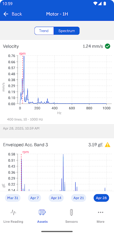 SKF QuickCollect 센서와 앱을 사용하면 광범위한 교육이나 진단 전문 지식 없이도 누구나 기계 상태를 모니터링할 수 있습니다. 사용하기 쉬운 SKF QuickCollect 앱을 사용하면 기계 상태를 빠르고 쉽게 확인할 수 있습니다. 기록 데이터는 시간이 지남에 따라 머신 상태가 어떻게 변하는지 보여줍니다.