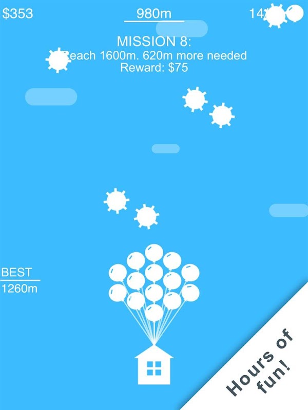 Spend hours playing this, relaxing, fun and addicting game trying to lift your house as high as you can. Collect rising balloons and destroy falling bombs to help lift the house higher. Collect coins along the way by destroying bombs. Use these coins to purchase upgrades and abilities in the shop. Complete missions and unlock awards for extra coins.