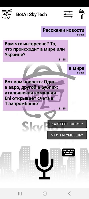 두 단어로 알람을 설정하고, 단순히 말하여 구문을 번역하거나, 예를 들어 손가락을 가리지 않고 모든 뉴스를 즉시 찾을 수 있습니다. 이 모든 작업은 SkyBot 음성 도우미가 수행할 수 있습니다. 정교한 인공 지능은 당신을 지루하게하지 않을 것이며, 풍부한 기능은 당신이 필요한 것을 오랫동안 찾는 것을 포기하게 만들 것입니다.