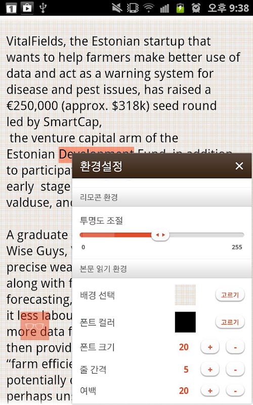 6) 리모콘의 보기 버튼을 클릭하면, 웹 / 본문 / 소스 보기가 제공됩니다. 본문 보기는 현재 페이지의 본문 영역을 추출하여 사용자가 지정할 수 있는 읽기 환경에서 볼 수 있도록 해줍니다. 그리고 단어를 터치하면 검색/번역 레이어가 나와 바로 검색 및 번역을 할 수 있습니다.