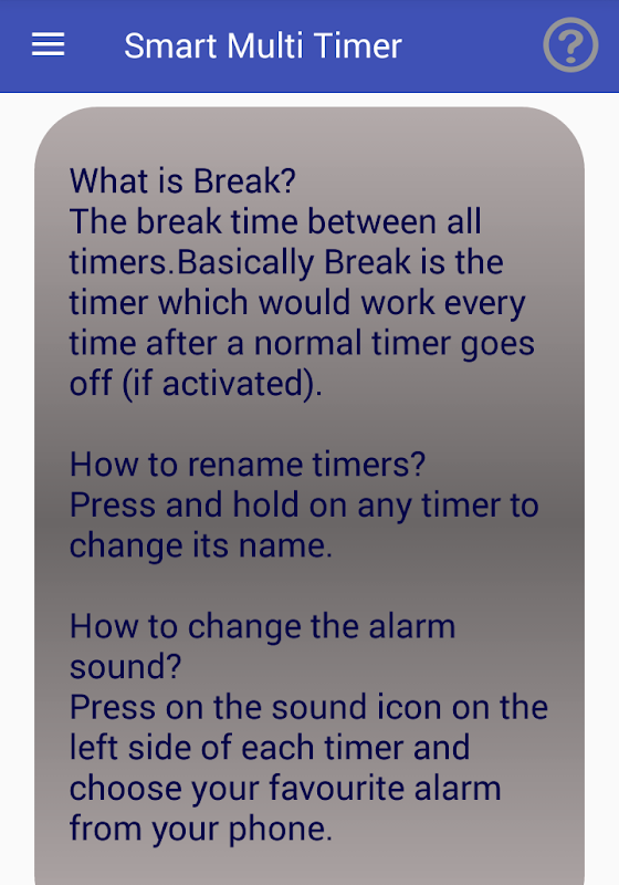 ✓ Ability to save your timer details for a later use (Names,timers,alarm sounds and breaks).