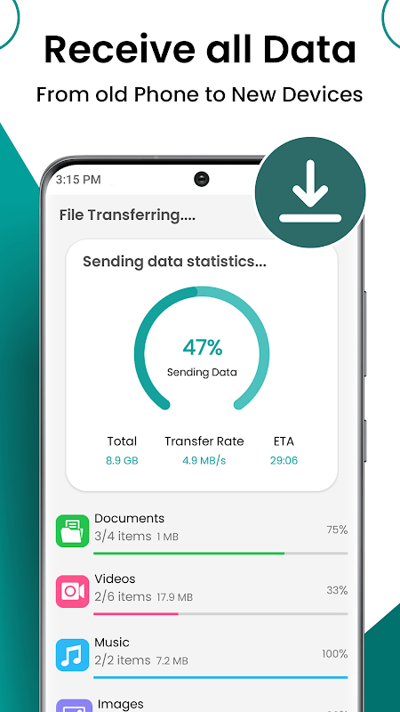 Phone Clone은 직관적으로 설계된 무료 데이터 전송 앱입니다. 사진, 비디오, 음악, 연락처, docx, apk 및 기타 대용량 파일을 포함한 파일을 새 장치에 빠르고 쉽게 공유할 수 있는 방법을 제공합니다. 모든 파일 전송 데이터 공유 앱을 사용하면 몇 분 안에 오래된 휴대전화에서 새 휴대전화로 중요한 데이터를 공유할 수 있습니다. 그러나 이 최신 복제 전화기는 데이터를 신속하게 마이그레이션합니다. 이제 원하는 것을 선택하고 최고의 Android 전송 도구를 통해 전화에서 전화로 데이터 무료 스마트 전환을 수행하고 전화 복제 앱을 공유하십시오.
