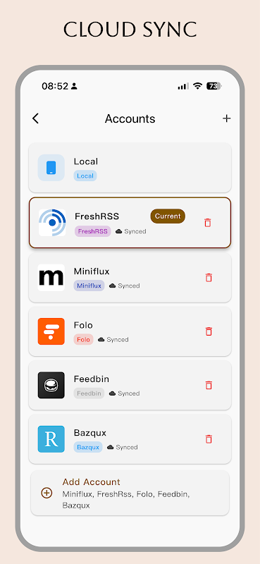 🔄 다중 계정 동기화 - Local, Miniflux, FreshRSS, Folo, Feedbin, Bazqux 및 Google Reader API 완벽 지원