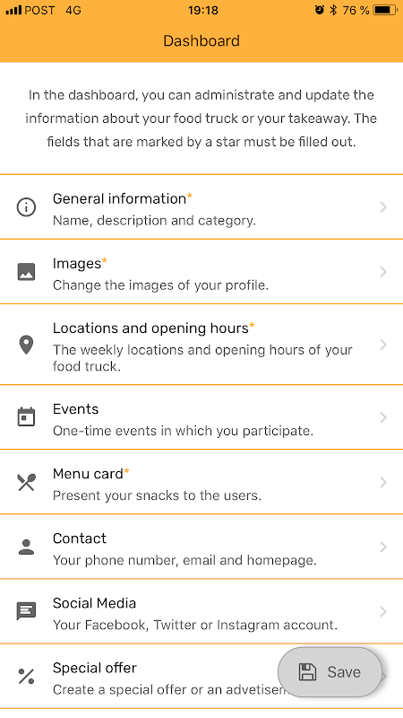 그런 다음 스낵 트랙 관리자로 몇 번의 클릭만으로 등록하여 메인 앱 "스낵 트랙"에 음식 트럭 또는 테이크 아웃을 등록하십시오. 관리자 앱을 사용하려면 먼저 웹 사이트 (www.snack-track.com)에서 계정을 만들어야합니다. 그런 다음 앱에 새 계정으로 로그인하고 음식점 트럭이나 테이크 아웃에 대한 데이터 (주별 위치, 메뉴 카드, 이벤트 등)를 관리자 앱에 표시 할 수 있습니다. 데이터를 입력 한 후에는 Google 팀에 정보를 보내면됩니다.