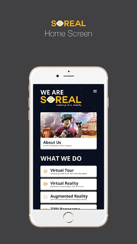 So Real application is made for showcasing our company and what we provide as a service and our lines of products. This app features our AR and VR products from multiple categories. We also feature our Virtual Tour lineup through a link from the app.
