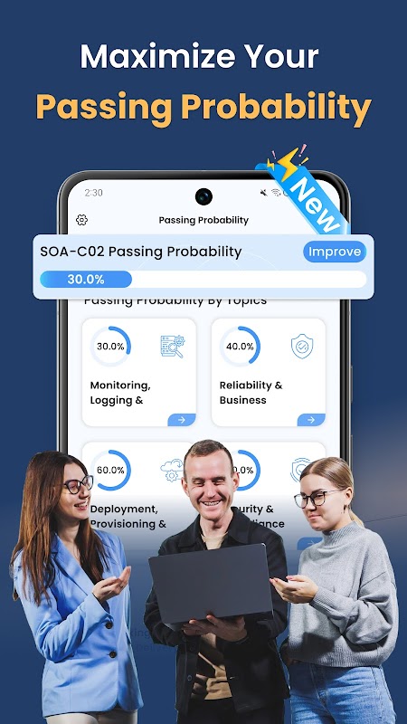 📊 성과 분석 및 합격 가능성: 시간 경과에 따른 성과를 분석하고 강점과 약점을 모니터링합니다. 또한, 연습 시험 성적을 바탕으로 시험 합격 가능성을 추정해 보세요.