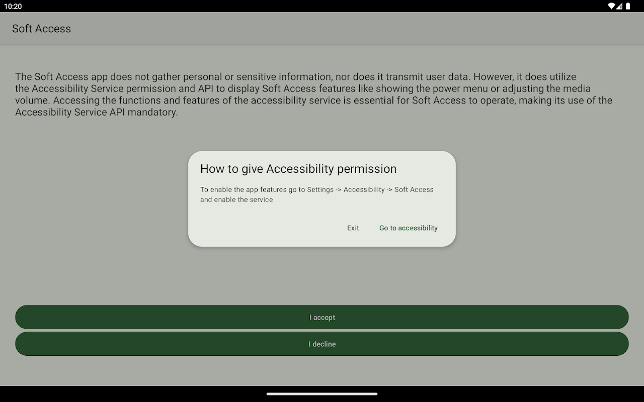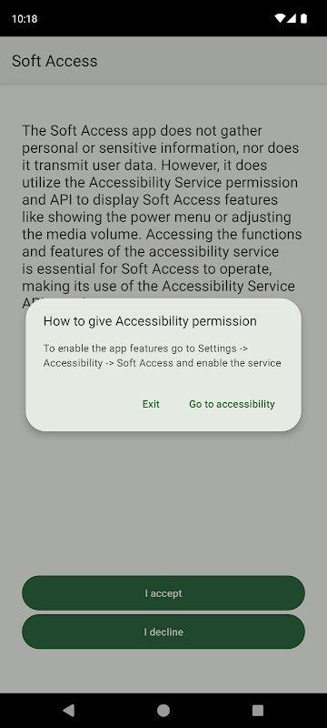 Soft Access 애플리케이션은 접근성 API를 사용하여 사용자에게 필수 기능을 제공합니다. 접근성 서비스를 활용함으로써 Soft Access는 전원 메뉴 옵션을 화면에 원활하게 표시하고 미디어 볼륨을 조정하여 모든 사용자의 손쉬운 액세스와 사용성을 보장합니다.