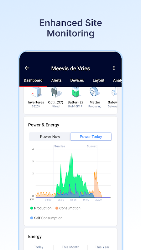 어디에 있든 SolarEdge Go를 통해 장비를 모니터링 및 관리하고, 사이트를 생성 및 편집하고, 사이트 사용자 및 장비를 관리하고, 경고 문제를 해결할 수 있습니다.