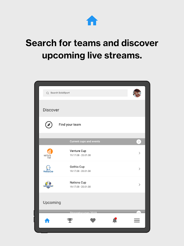 앱의 검색 기능을 통해 원하는 팀, 협회 또는 컵을 찾을 수 있습니다. 가능한 모든 팀 및 협회의 수천 개의 방송이 Solidsport에 있습니다.