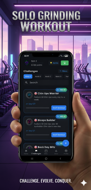 Solo Grinding Workout은 기초부터 시작하여 헌신과 꾸준함을 통해 레벨을 올려나가는 피트니스 챌린지 앱입니다.