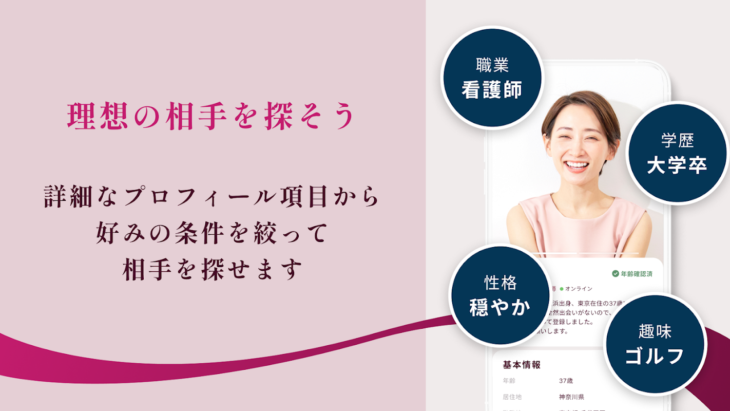 20대용의 매칭 앱에는 없는 상세한 프로필 항목을 준비해, 이상의 상대를 만날 수 있습니다.결혼력·아이의 유무나, 상대의 결혼관(가사·육아·일·가계 등)을 사전에 확인 할 수 있습니다.상대의 프로필과의 공통점을 한눈에 알기 때문에, 페어링(매칭) 후의 대화도 고조되는 것 틀림없음!