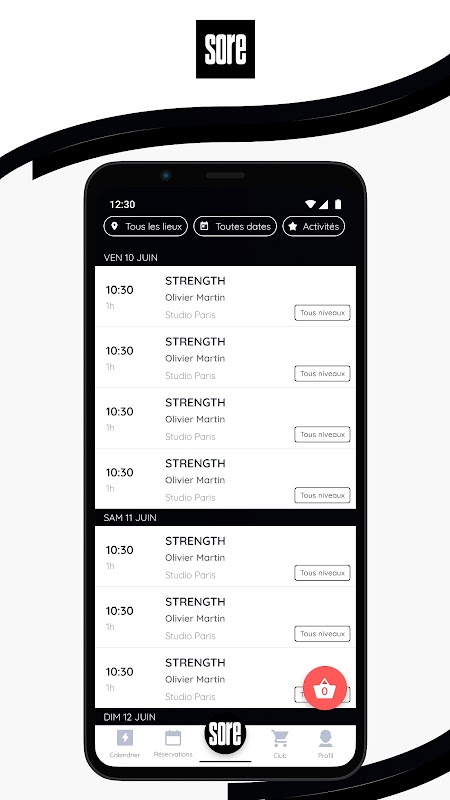 SORE 애플리케이션을 다운로드하면 간편하게 일정에 액세스하고 지금 그룹 레슨 세션을 예약할 수 있습니다.