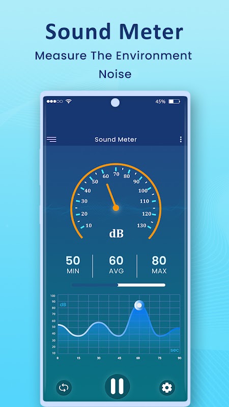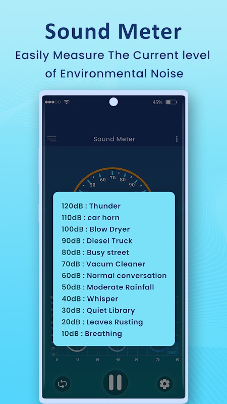 소음 측정기 : dB Meter & Noise meter 앱은 주변 소음을 측정하여 데시벨 값을 표시하고 측정된 dB 값을 다양한 형태로 표시합니다. 스마트한 사운드 미터 앱으로 하이 프레임으로 깔끔한 그래픽 디자인을 경험할 수 있습니다.