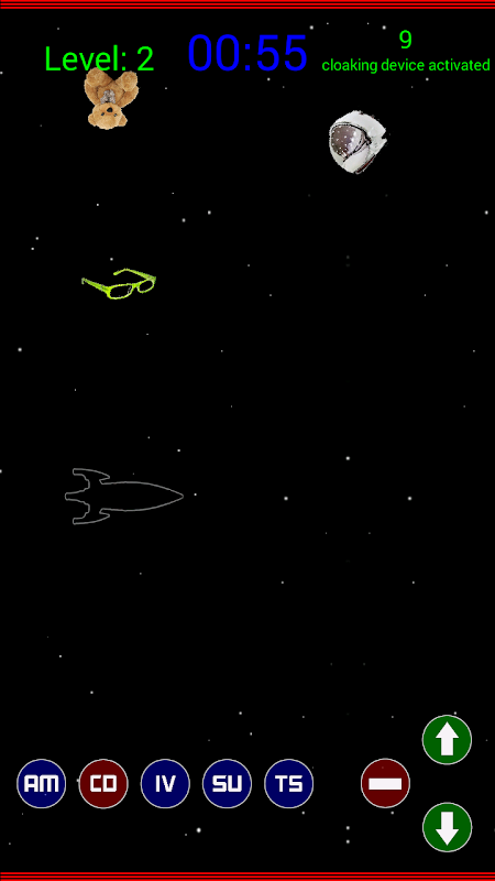 Your space ship has five upgrades which can be activated only once during the game and will make your ship invincible for 10 seconds (you still need to avoid the force fields). These special features can be tricky though. For example, when you activate invisibility your ship will become invincible BUT it will also be invisible to you! The only way you can briefly see your ship is by moving up or down and visualize the booster rockets in action! When a special feature is about to disengage, a voice caution message will warn you.