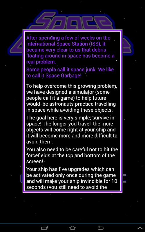 Space Garbage is optimized for the following devices: 7-inch, 8-inch and 10-inch tablets, high resolution smartphones with a screen size larger than 4 inches.
