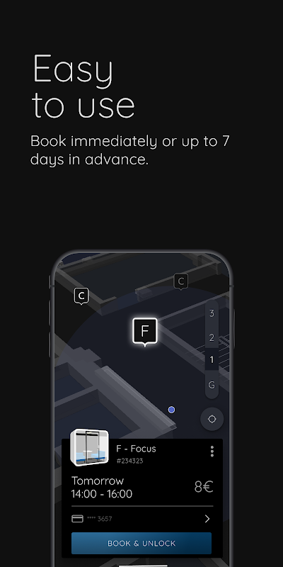 혼자서 또는 다른 사람과 함께 일하는 것은 가능한 한 편리해야합니다. 이것이 바로 우리가 업무 공간 예약에 익숙한 승차 공유 및 전기 스쿠터 경험을 제공하는 이유입니다. 신용 카드로 편리하고 안전하게 결제하고 이제 전기 잠금 장치를 제어 할 수 있습니다.