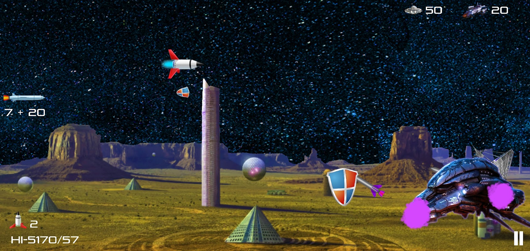 레벨 2 게임 플레이: 우주선이 외계 행성에 도착했습니다. 여기에 적의 함선을 탐지하고 공격하여 파괴하는 유도 미사일의 추가 능력이 있습니다. 당신의 목표는 우주선과의 충돌을 피하기 위해 다양한 외계인 차량, 레이저 안테나, 공격 선박 및 기타 비행 물체를 파괴하거나 피하고 외계인 UFO 및 군함과 싸우는 것입니다. 우주선을 보호하기 위해 소행성 방패 및 에너지 거품과 같은 특수 능력을 자주 사용할 수 있습니다. 일반 및 유도 미사일을 사용하여 목표물을 파괴할 수 있습니다. 마지막으로 슈퍼 보스(강력한 적의 함선)와 싸우고 그것을 파괴하여 적의 슈퍼 군함에 도달하여 점령하십시오. 당신이 피하거나 파괴하는 모든 물체는 당신의 점수를 증가시킬 것입니다. 비행 중에 별, 유성, 은하, 성운, 다른 행성, 블랙홀 및 웜홀의 멋진 전망을 즐기십시오. 언제든지 게임을 일시 중지하여 특수 능력, 일반 및 유도 미사일, 추가 생명을 얻을 수 있습니다.