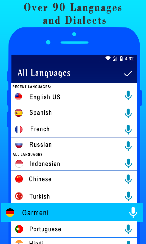 음성 인식 : 마이크로 말하고 다른 언어를 선택하여 텍스트로 번역 할 수 있습니다.
