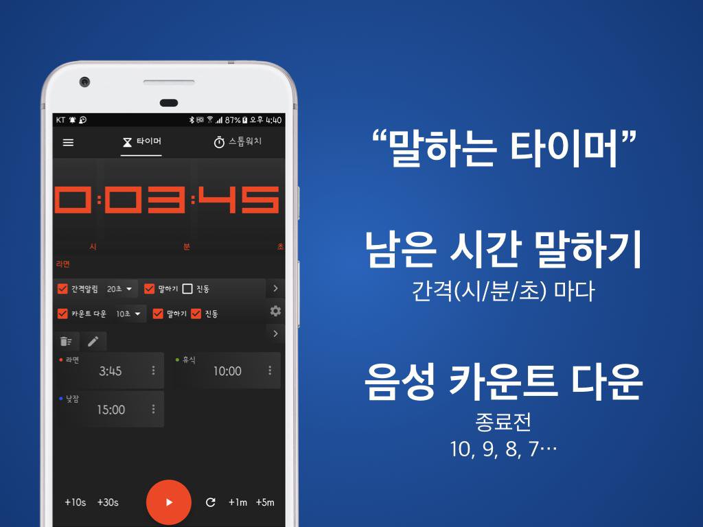주기적으로 남은 시간을 말하고, 종료 전 음성 카운트다운, 만료 후 음악(mp3)재생 및 자동 종료 타이머. 랩타임 / 랩기록 말하기 스톱워치