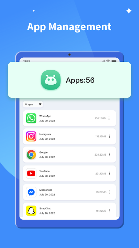 앱 관리: 앱 관리를 통해 사용자는 기기에 설치된 모든 앱을 확인할 수 있으며, 앱 크기, 설치 날짜, 업데이트 시간, 사용 권한 등을 확인할 수 있습니다.